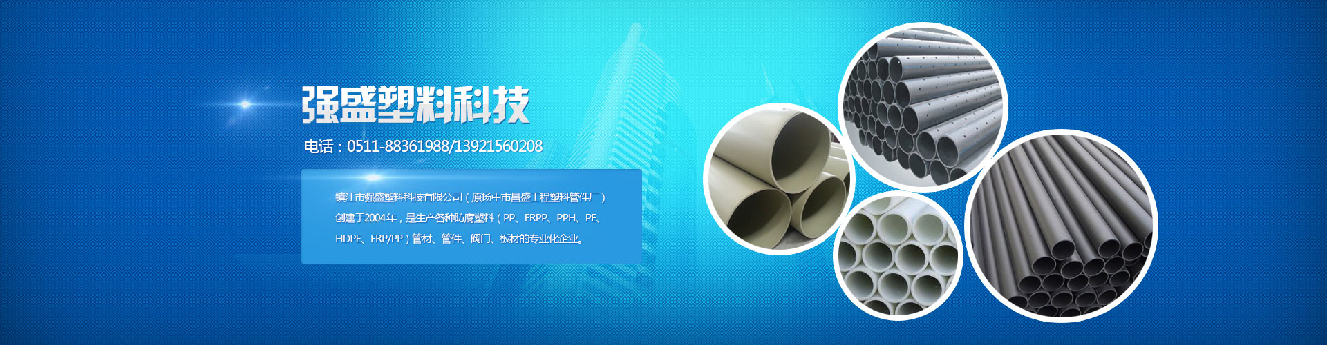 鎮(zhèn)江市強盛塑料科技有限公司(原揚中市昌盛工程塑料管件廠)創(chuàng)建于2004年,是生產(chǎn)各種防腐塑料(PP、FRPP、PPH、PE、HDPE、FRP/PP)管材、管件、閥門、板材的專業(yè)化企業(yè)。公司擁有各類先進生產(chǎn)設(shè)備,固定資產(chǎn)約3800萬元,可生產(chǎn)管材、管件口徑為Φ15-Φ1200mm,產(chǎn)品規(guī)格齊全。目前產(chǎn)品廣泛適用于醫(yī)藥、食品、冶金、造紙、電力、礦山、城市污水處理、垃圾填埋、輕工紡織等領(lǐng)域,暢銷全國各省市自治區(qū),遠銷二十多個國家及地區(qū)。